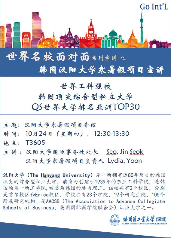 韩国汉阳大学将在我校召开寒暑假项目宣讲会,针对2019年寒假项目以及2020年暑假项目进行宣讲,欢迎感兴趣的同学参加,宣讲会具体安排如下: